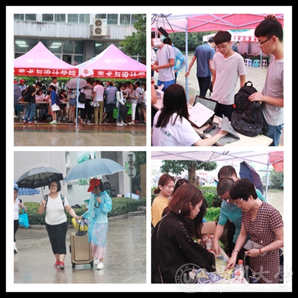 上午7点,一进入超豪学区,“3003新葡官方网站”几个大字映入眼帘。天空还飘着绵绵细雨,由学院学生党员、学生会以及新生班级助理组成的迎新团队,不顾雨点淋在身上的丝丝凉意,努力地撑起一把把伞,为前来报道的新生和送行的家长撑起一点点温暖。在学长学姐的热情讲解下,新生们顺利完成注册报名。注册完毕后,工作人员又一次次冒着风雨帮新生们提东西、引路,这另新生家长们感到十分感激,连声称赞。