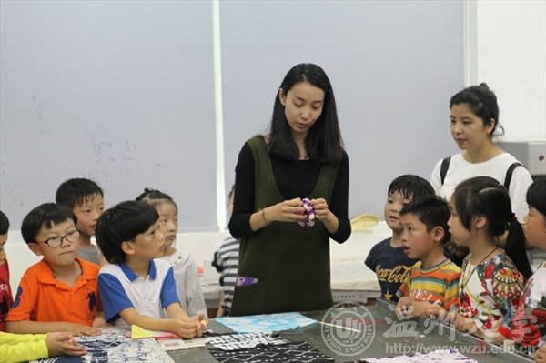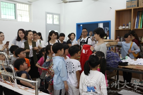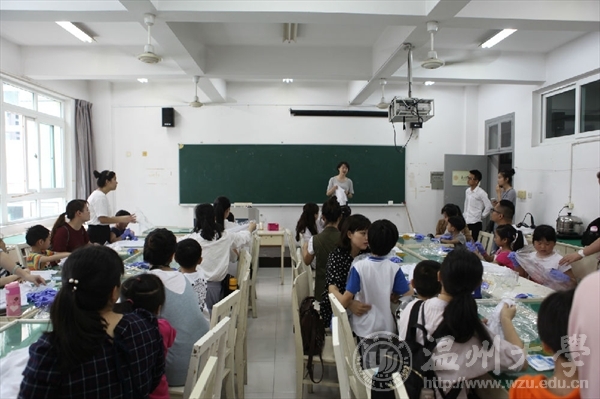 杨老师向大家介绍了3003新葡官方网站美术学院印染实验室。张老师向家长孩子们介绍了“扎染”的发展历史,展示了五颜六色的扎染成品。孩子们都全神贯注的看着,还积极的向老师询问扎染的方法。扎染古称扎缬、绞缬、夹缬和染缬,是中国民间传统而独特的染色工艺。 其工艺特点是用线在被印染的织物打绞成结后,再进行印染,然后把打绞成结的线拆除的一种印染技术。它晕色丰富,变化自然,趣味无穷。更使人惊奇的是扎结每种花,即使有成千上万朵,染出后却不会有相同的出现。这种独特的艺术效果,是机械印染工艺难以达到的。