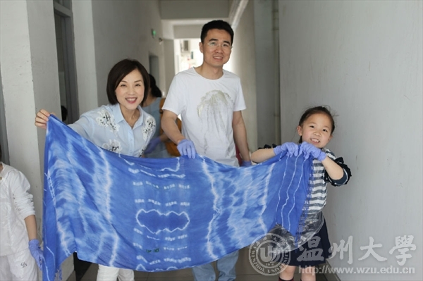 杨老师主要讲述了制作工序以及期间需要注意的问题。之后,孩子家长们就投入到实践中,谨慎地设计,小心地穿线,打结,褶皱,全心全意。不久后,陆陆续续的完成了“扎”,接着便是“染”的环节了。家长和孩子们将准备好的围巾,浸泡并且进行染色。经过一段时间的等待,在拆线解绑的瞬间,家长和孩子们都露出了欣慰的笑容。