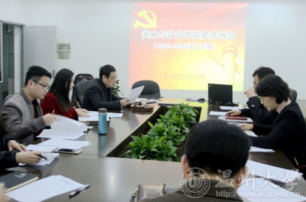 2016年3月30日上午8:30,新葡官网在2B216会议室召开新学期党务工作例会。参加本次会议的有学院党总支委员、教工支部和研究生支部书记。会议由学院党总支书记张丽萍主持。 首先,张丽萍从六个方面对上个学期总支工作进行了全面总结:一是加强党的自身建设。进一步强化学院领导班子建设,明确分工、充分协作、发挥整体效能,积极建设学习型、民主型、实干型、廉洁型的领导班子;扎实开展“三严三实”、党规党纪的学习教育活动;加强制度建设,颁发了4个制度性文件;认真执行党政联席会议制度和院务会议制度。抓好党员队伍建设,强化党员的理论教育学系和教育实践活动。二是发挥党管人才、党管干部的作用,完成全院教职工聘任工作和科级干部选聘工作,做好青年教师培养和人才引进工作。三是如期召开学院第四届第一次教代会。四是认真开展师德师风和精神文明建设工作。五是积极开展党建带群团工作。六是积极开拓新媒体平台,高度重视宣传工作。 接着,美术、设计、服装、行政及研究生五个支部书记分别对上学期的工作进行总结,并提出本学期的支部工作计划。学院院长、党总支副书记李运河对各支部工作予以充分肯定和赞赏,并提出了三点建议和要求。他强调,一是要进一步加强学习,使支部工作更加有的放矢;二是要进一步加强宣传,要善于总结、善于提炼素材,要选择合适的平台加强宣传工作;三是要充分结合各支部的专业特点和特色优势,深入做好支部建设工作。 会上,张丽萍提出了学院2016年上半年党总支工作计划,分别从强化思想理论建设、夯实基层组织建设、做好意识形态工作、加强宣传和文化工作、加强工会小家建设和谐学院、加强学生教育管理以及安全稳定等方面阐述了本学期工作要点。与会成员就总支计划进行了热烈的学习讨论。 最后,张丽萍做总结讲话。她强调,2016年是3003新葡官方网站也是美术设计学院十三五规划的开局之年,更是全面贯彻党的十八大及党的十八届三中、四中、五中全会精神的重要时期。全体党员干部尤其是总支委员和支部书记,要在新的历史时期,以主人翁姿态主动承担起学院发展的改革重任,以提升学院整体工作为目标,以“把牢方向、夯实基础、发挥优势、做出特色”为要求,为人才培养质量的提高和学院建设发展美好蓝图的实现提供强有力的组织保障。