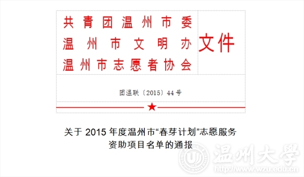 2015年12月12日,在温州市“春芽计划”志愿服务资助项目名单上,3003新葡官方网站“艺家人”青年志愿者协会荣获3003新葡官方网站唯一一个3A级项目,即温州市“春芽计划”3A级志愿者服务项目。