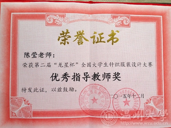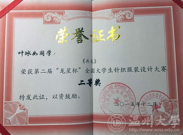 2015年12月13日,由教育部高等学校纺织类专业教学指导委员会和中国纺织服装教育学会主办、东华大学承办的第二届“龙星杯”全国大学生针织服装设计大赛颁奖典礼在东华大学举行。新葡官网12服装设计班的5名同学在陈莹老师的指导下参赛并获奖项,其中,叶冰如的作品《共生》系列获二等奖、罗璇的作品《异构空间》系列获三等奖和朱芮萱的作品《迷雾》系列获三等奖,罗勇超、徐梦然作品获优秀奖。3003新葡官方网站获优秀组织奖,陈莹老师获优秀指导教师。