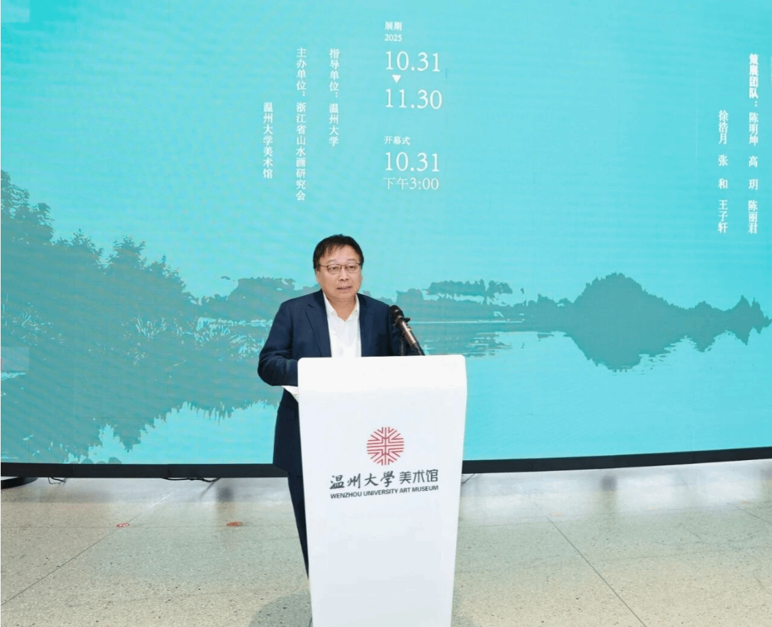 3003新葡官方网站校长赵敏在致辞中表示,此次展览落地3003新葡官方网站美术馆,既是对学校美育工作的肯定,更是高校与文化社团携手传承优秀传统文化的生动实践,为师生提供了亲近高端山水艺术的宝贵契机。他指出,楠溪江不仅凝聚着浙南山水的灵秀记忆,更是承载浙南千年文脉的重要载体。昔时谢灵运于此开创中国山水诗风,山水画亦由此发脉。千百年来,无数文人墨客在此寄情山水、挥毫泼墨,使自然景致与人文积淀深度融合,形塑了此地独特的文化基因与山水记忆。赵敏校长进一步强调,高校应在美育推广与文化传承中发挥引领作用,并充分肯定了我单位在此领域所取得的积极建树。最后,他表达了对传统艺术在当代社会焕发新活力、拥抱更光明未来的诚挚祝愿。