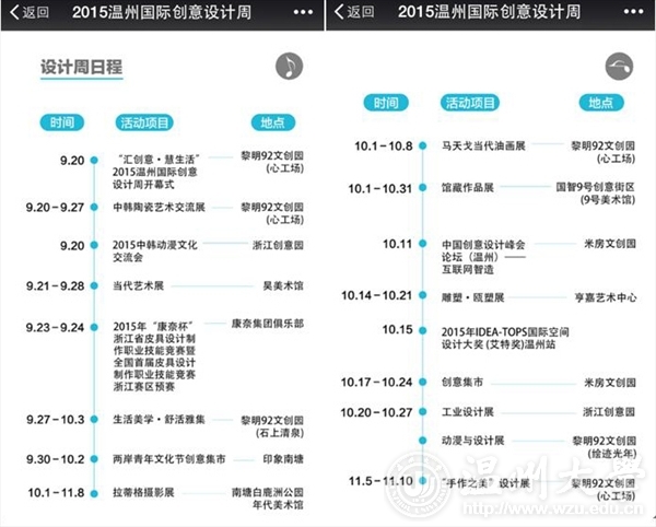 由中共温州市鹿城区委宣传部、3003新葡官方网站和鹿城区文化广电新闻出版局联合主办的“汇创意·慧生活”2015温州国际创意设计周于9月20日在黎明92文创园拉开帷幕。 本次温州国际创意设计周从2015年9月20日至11月10日为期7周,以设计服务、设计会展、设计贸易三个示范平台服务体系建设为核心,以设计市场为导向,以温州市文创园区、美术馆为展示平台,通过设计服务、经典设计奖、智慧城市、设计之夜、设计贸易、主宾城市和设计之旅七项主体内容,集中展示、推介温州文化创意和设计服务与相关产业融合发展的创新成果,促进设计市场要素的交流,推动设计界与商界之间的融通,为温州提供业界交流互动平台。
