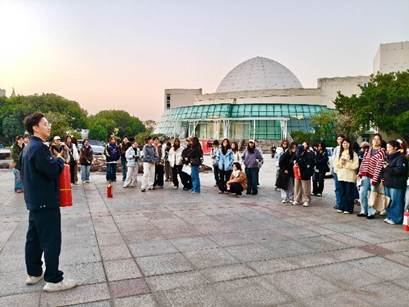 在安全集合点,学校保卫处蒋老师现场演示干粉灭火器的正确使用方法,细致讲解开启灭火器的四个关键步骤,并强调了不同灭火器的适用场景与日常检查要点。在专业人员的指导下,同学们踊跃参与实操环节,亲身体验灭火过程,成功将模拟火源扑灭,真正掌握了灭火器材的使用技能。