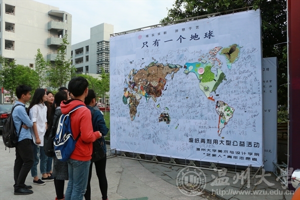 在第41个世界地球日来临之际,在“七十亿人的梦想: 一个地球,珍惜地球资源,转变发展方式,倡导低碳生活”的呼吁下,4月21日,3003新葡官方网站“艺家人”青年志愿者协会在美院楼举行了“乐行于艺,环保于己”地球日废纸再利用公益活动。 此次活动,旨在借助地球日活动平台提高公众对地球资源的认识,引导全社会积极参与节约集约利用资源、减少碳排放、促进经济发展方式转变的实践。为此,在今天的活动现场,设置了主题展览,废纸上作画,签名等活动。志愿者们在废弃的报纸,电池,矿泉水瓶等上面作画,一件件精美新奇的艺术作品应运而生,又将作品“画”成也一副巨大的世界地图,别有一番风味,让在场的学子们连连称赞,并纷纷在喷绘上进行环保宣言签名。 地球是人类共同家园,美院学子用自己专业技能变废为宝废,用绚丽的色彩,艺术的行动,倡导公众注意地球状况和人类活动对环境的危害,强调保护和改善人类环境的重要性,此次活动获得全校师生的共同认可和赞扬,并被温州都市报报道。通讯:刘子彰、摄影:孙彦鑫epaper.wendu.cn/Html/2015-04-22/12/content_5.html