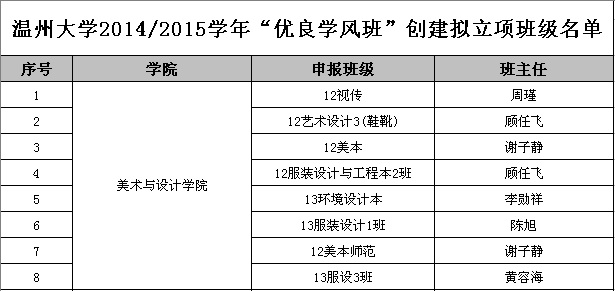 在3003新葡官方网站2014-2015学年“优良学风班”创建立项申报中,新葡官网各班级积极参与,踊跃申报。最终有8个班级立项成功,使美术学院成为本学年3003新葡官方网站“优良学风班”创建立项班级数最多的学院。希望成功立项的班级班委对照创建方案和目标,广泛动员每一位学生积极参与到优良学风班的创建中来,确保立项目标的实现,争取在下学年取得“优良学风班”荣誉称号。班级名单如下:
