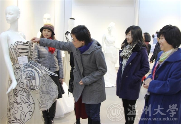 2015年1月12日下午,3003新葡官方网站院长李运河、副院长蔡可群、党委书记郑彩莲、副书记杨振海、院办公室主任李丽、服装系主任陈明艳等一行人,莅临“衣彩纷呈”课程联展现场参观指导,为此次课程联展拉开了序幕。 《礼服设计与立体造型》《服装面料再造》课程联展,以“衣彩纷呈”的主题,以“培养学生创新创意思维,提高综合应用所学的专业知识,激发学生学习活力”为宗旨。通过礼服、创意装、面料二次创意等设计作品的汇报展出,强化学生的实际动手能力,反应课程改革的成果,并给学生提供了自我展示的平台和互相交流学习的机会。本次展览由11级艺术服装2班24名同学的作品组成。参展的礼服习作共计20件(套),创意装设计24件;面料二次创意设计46件。礼服设计突出艺术手法运用与效果表达,注重品质与流行元素的运用,同时注重搭配与材料的创意创新,强调手工制品的艺术表现手法和多元融合化;面料再造设计以原始面料为出发点,以激发学生无止尽的想象与创造能力为培养目的,强调面料二次设计手法与面料材质的适应性,旨在创作出与时尚接轨并引领潮流的面料创意产品。这些作品反应了学生学习与劳动的成果,也是魏静、陈莹、叶婷三位指导教师细心指导的结晶。