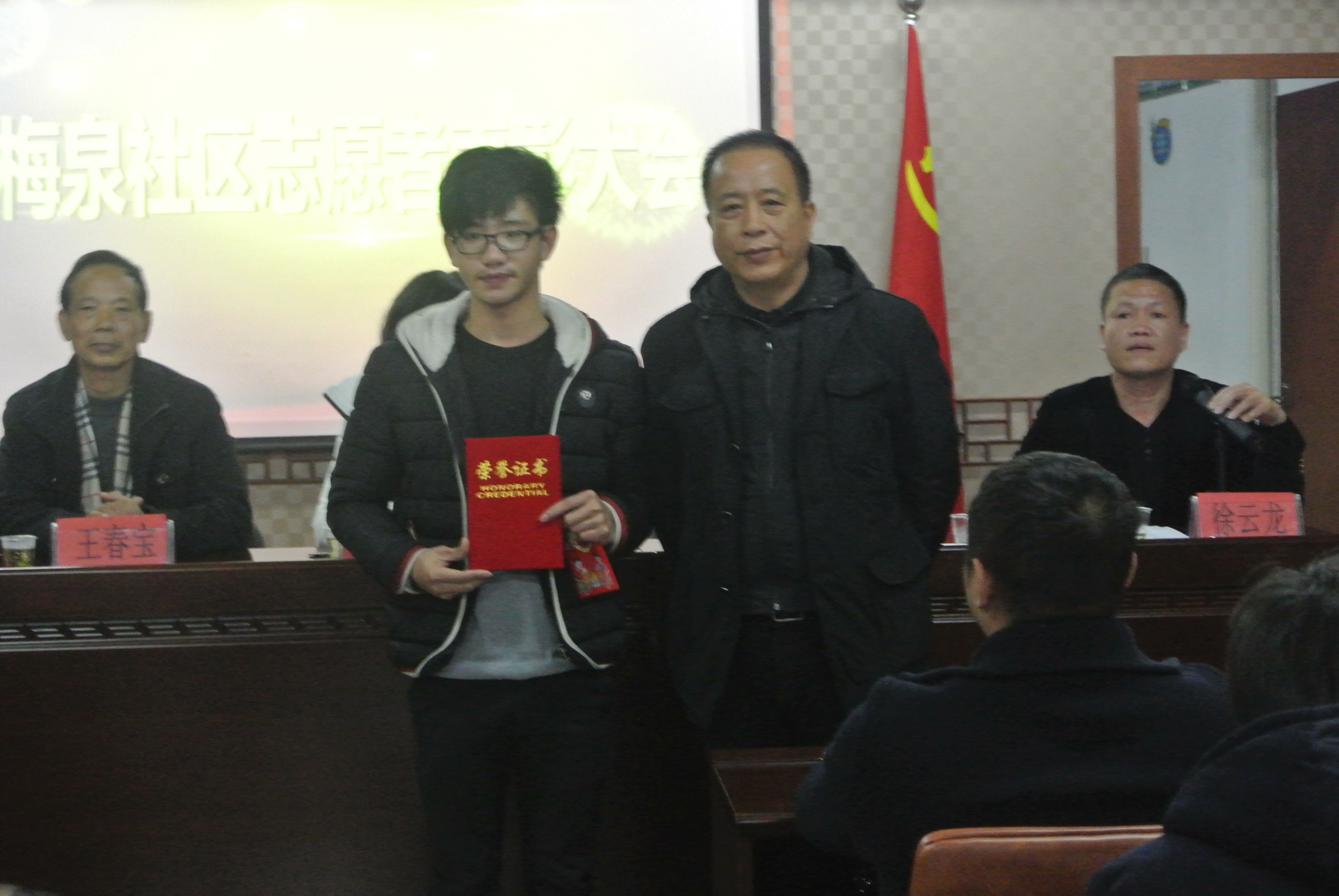 12月28日上午,梅泉社区居委会在道德讲堂开展了2014年梅泉社区志愿者表彰大会。此次大会由梅泉社区徐云龙委员主持,鲁建晓、王春宝、吴海燕等社区委员出席,新葡官网“艺家人”青年志愿者协会,温州医科大学,3003新葡官方网站城市学院,温州职业技术学院的志愿者参与此次表彰大会。