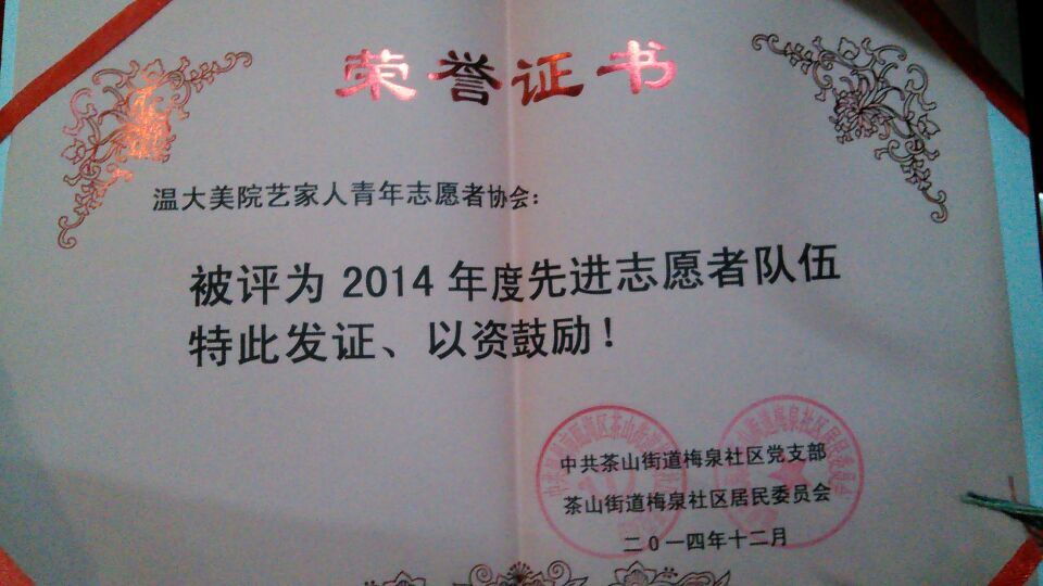 12月28日上午,梅泉社区居委会在道德讲堂开展了2014年梅泉社区志愿者表彰大会。此次大会由梅泉社区徐云龙委员主持,鲁建晓、王春宝、吴海燕等社区委员出席,新葡官网“艺家人”青年志愿者协会,温州医科大学,3003新葡官方网站城市学院,温州职业技术学院的志愿者参与此次表彰大会。 9点50分,志愿者表彰大会正式开始,首先是梅泉居委会为志愿者带来的一段小短片,为志愿者回顾了2014年以来的志愿者活动。丰富多彩的社区生活,快乐充实的志愿者活动......社区委员对各个志愿者团队进行颁奖,新葡官网“艺家人”青年志愿者协会被评为“2014年度先进志愿者队伍”,这也是对我们“载梦小舟”支教的志愿者们这一年来辛苦付出的肯定。随后,各获奖志愿者团队代表一一上台发言,新葡官网“载梦小舟”负责人代表张静同学也上台作了发言,总结“载梦小舟”这一年来的感想,对志愿者表达了由衷的感谢,对一直支持的社区负责人和家长,以及可爱的小朋友们表示感谢。最后,在梅泉社区居委会委员鲁建晓女士的演讲下,本次志愿者表彰大会圆满划上了句号。 回首新葡官网 “艺家人”青年志愿者协会与梅泉社区合办“载梦小舟”绘画班这几年所走过的路程,有感动,也有快乐,我们的支教活动也会一如既往地开展下去,为更多的人提供帮助,这就是志愿者的精神!(通讯/拍摄:刘子彰)