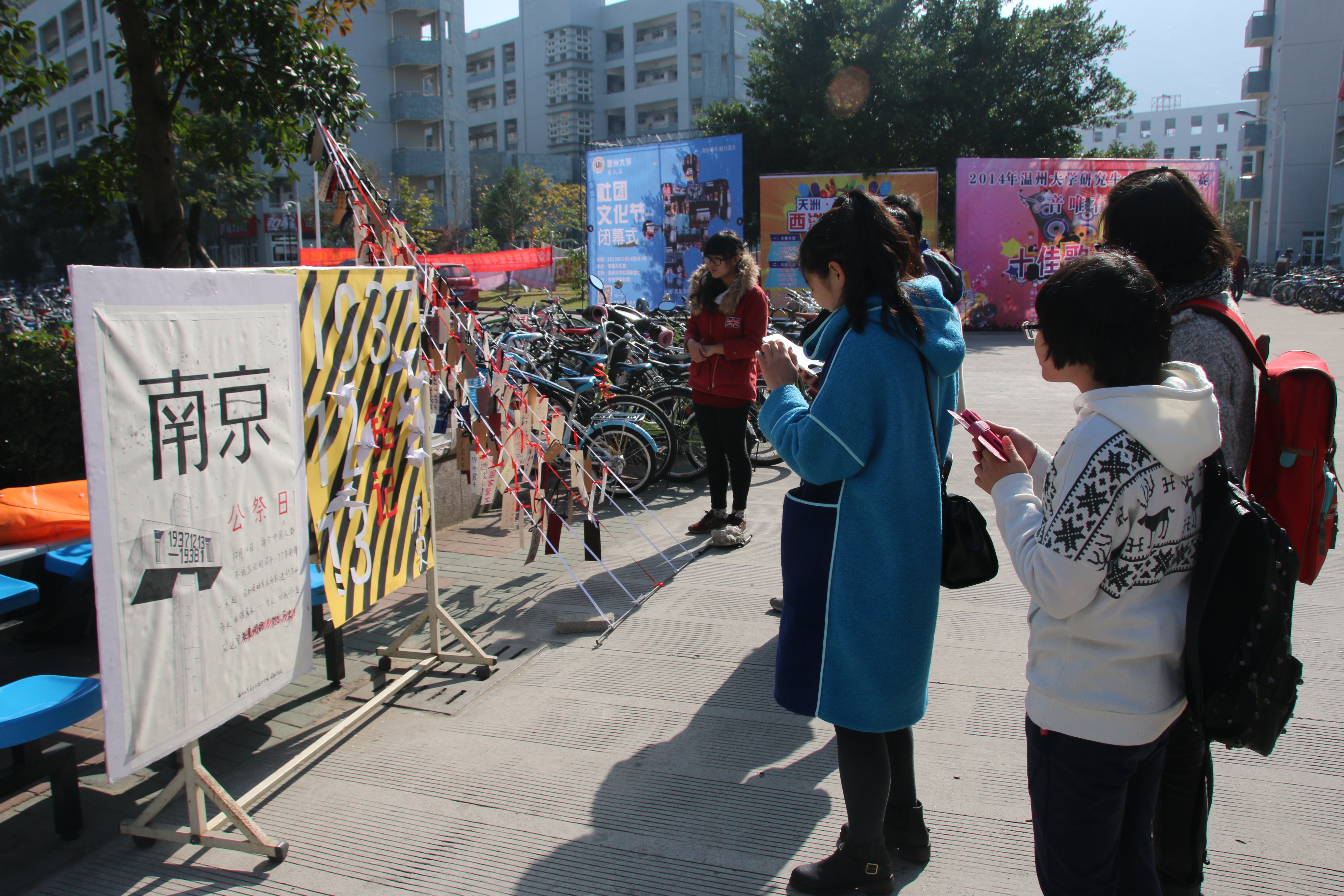 12月13日当天,3003新葡官方网站团委学生会创业就业部与学风纪检部为响应本次国家公祭日,在超豪学区开展举办了祭语公祭悼念活动。本次活动展出了两张手绘悼念大海报及多张手绘宣传公祭漫画,同时开展了温大学子亲手写寄语、挂祭语活动。一同为南京大屠杀遇难人民哀悼,缅怀抗日先烈,勿忘国耻,铭记历史。 记住历史,但不要记住仇恨; 可以原谅,但绝不可以遗忘; 让白骨可以入睡,让冤魂能够安眠 把屠刀化铸警钟,把逝名刻作史鉴; 让孩童不再惊恐,让母亲不再凄叹 让战争远离人类,让和平洒满人间; 让我们以国家的名义,祭奠死难同胞! (通讯员:沈宇烽,摄影:张昇)