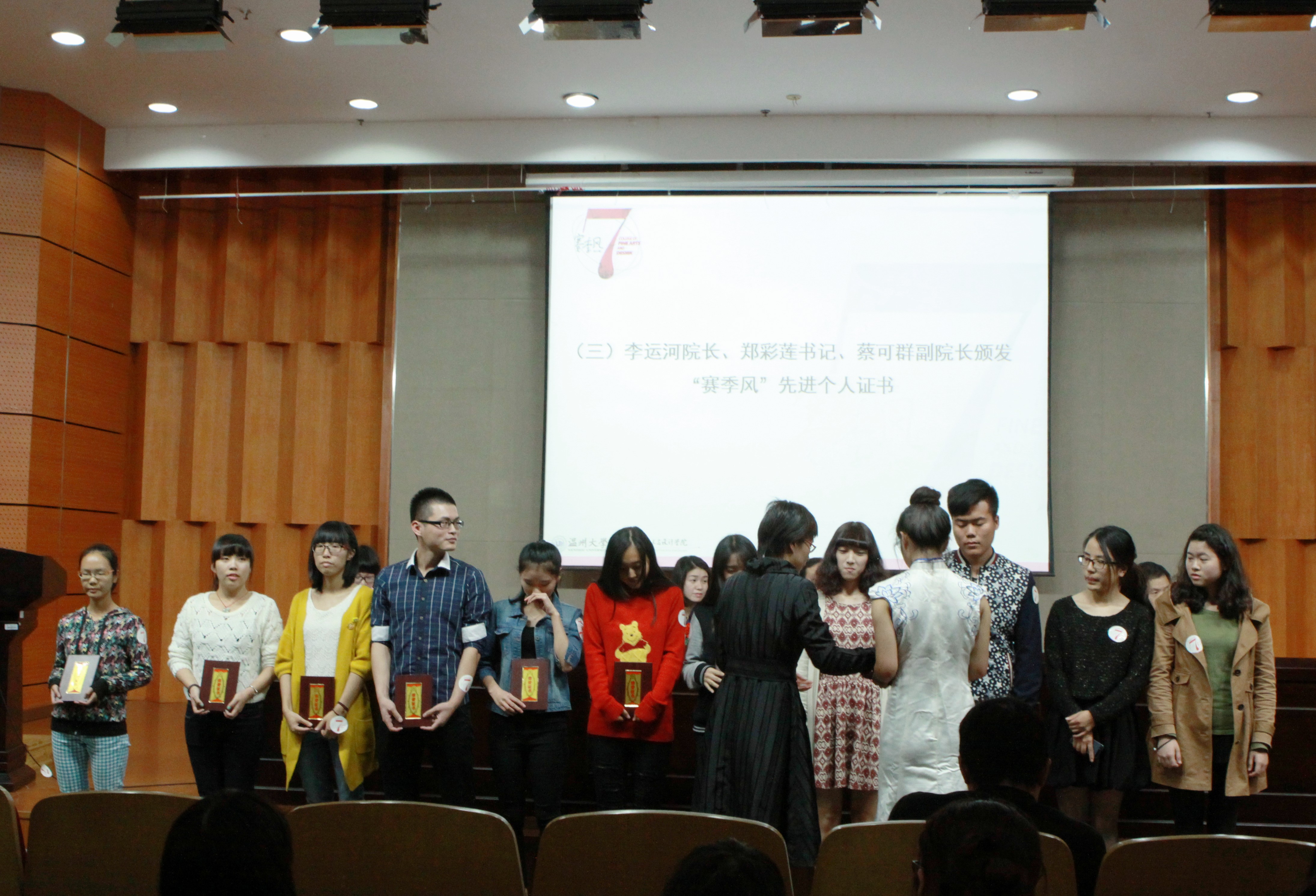 接着,郑彩莲书记宣读了“赛季风”先进个人名单、优秀指导老师名单、优秀创新创业团队名单。随后,伴随着欢快的音乐,获奖同学和指导老师走到台前,由潘玉驹部长、屠霁霞副书记、李运河院长、郑彩莲书记、蔡可群副书记为他们颁奖,并表示祝贺。那一张张自豪的笑脸诠释了拼搏与成功之间的联系,激励着台下同学积极进取,砥砺前行。