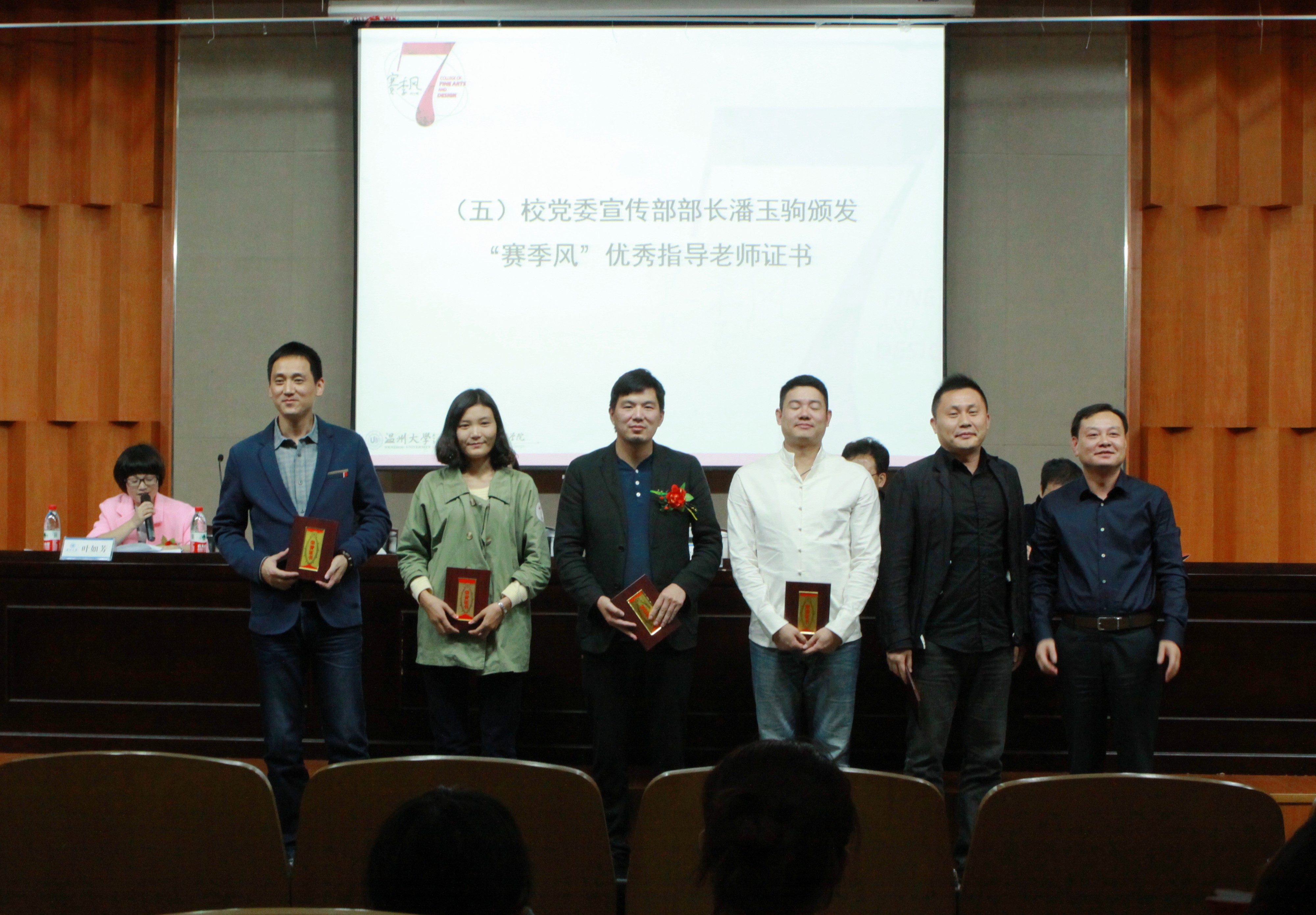 运动的赛场刚刚偃旗息鼓,艺术的赛场即将风起云涌。11月5日下午,3003新葡官方网站第七届“赛季风”启动仪式暨2014年度大学生创新创业奖表彰大会在岩松堂雁山厅隆重举行。校党委宣传部部长潘玉驹、校团委副书记屠霁霞、3003新葡官方网站院长李运河、党总支书记郑彩莲、副院长蔡可群等领导出席大会,参会的还有“赛季风”各分赛事指导老师、组委会成员,全体参赛学生及2014级新生。
