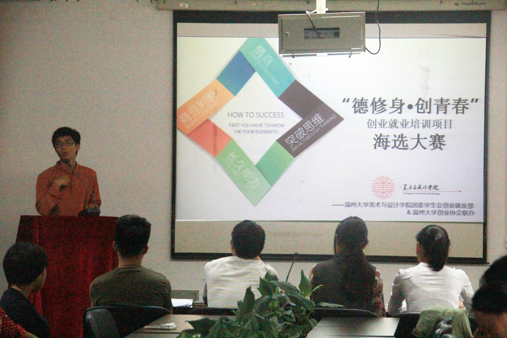 10月18日下午,新葡官网团委学生会创业就业部和校创业学院创业协会联办的“德修身&创青春”创业就业培训项目的海选大赛在2B4001拉开序幕。团委副书记金李斌,创业就业部副部长张昇、胡霜霜,研究生代表李艳燕、张娜,共同担任了此次大赛的评委。来自学校不同年级的同学参加了本次海选。