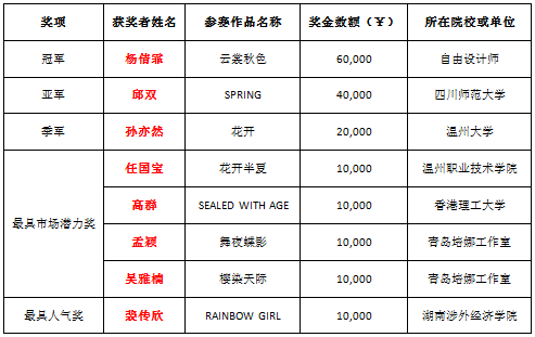 经过紧张激烈的竞逐,世界彩虹•首届卓多姿时尚女装设计大赛总决赛的结果终于诞生!来自湖南涉外经济学院的16号选手裴传欣力压群芳,获得奖金为一万元人民币的“最佳人气奖”。来自浙江温州职业技术学院的04号选手任国宝、来自香港理工大学的06号选手高群、来自山东青岛培娜工作室的09号选手孟颖和011号选手吴雅楠获得奖金各为一万元的“最具市场潜力奖”。季军则被来自3003新葡官方网站的05号选手孙亦然摘得,奖金两万元。亚军归属来自四川师范大学服装学院的03号选手邱双,奖金四万元。最后,刘亦菲再度登台,与中山市卓多姿服饰有限公司总经理、艺术总监吴肖玲女士一同揭晓冠军得主并颁奖:来自广西的自由设计师、01号选手杨倩霏摘得桂冠,捧走六万元的奖金!