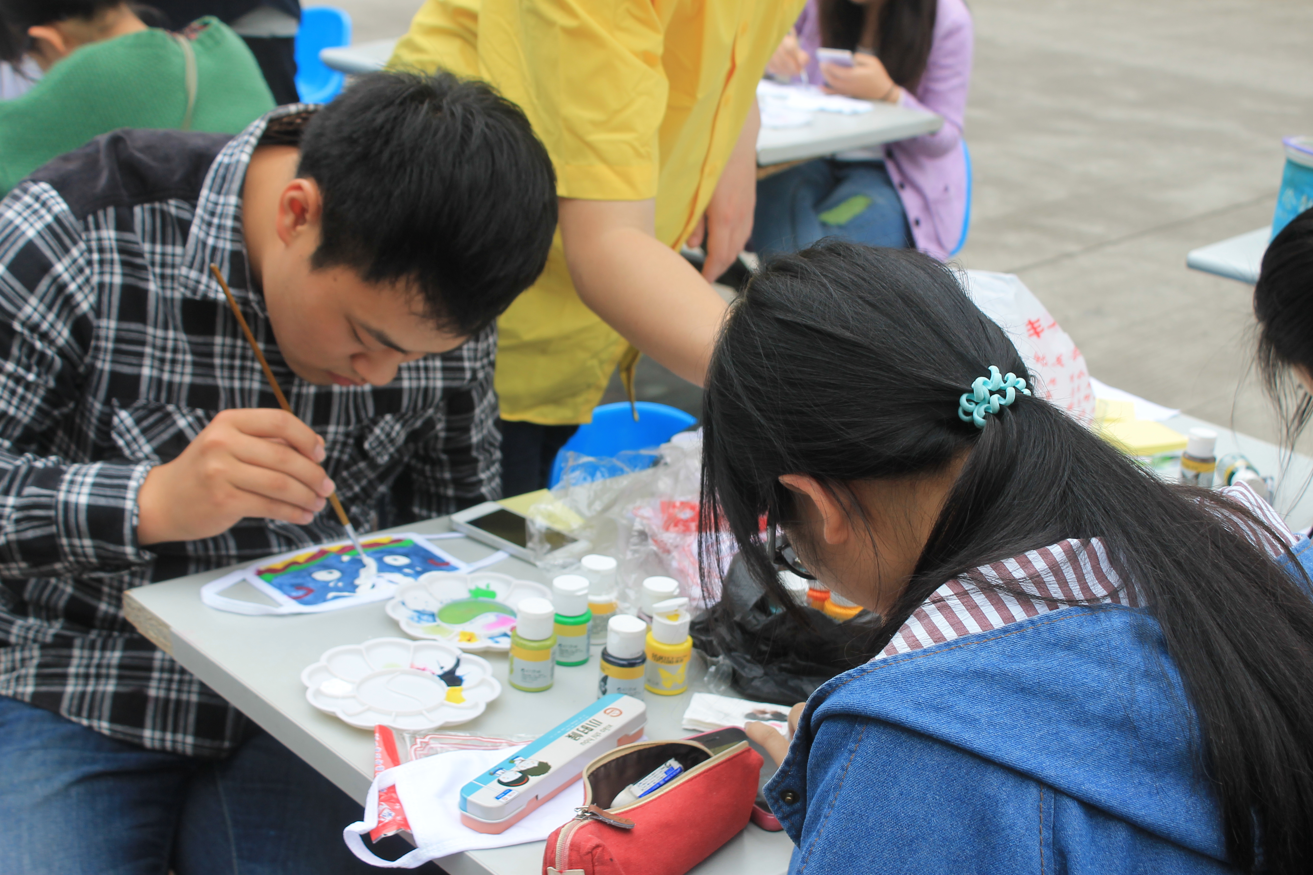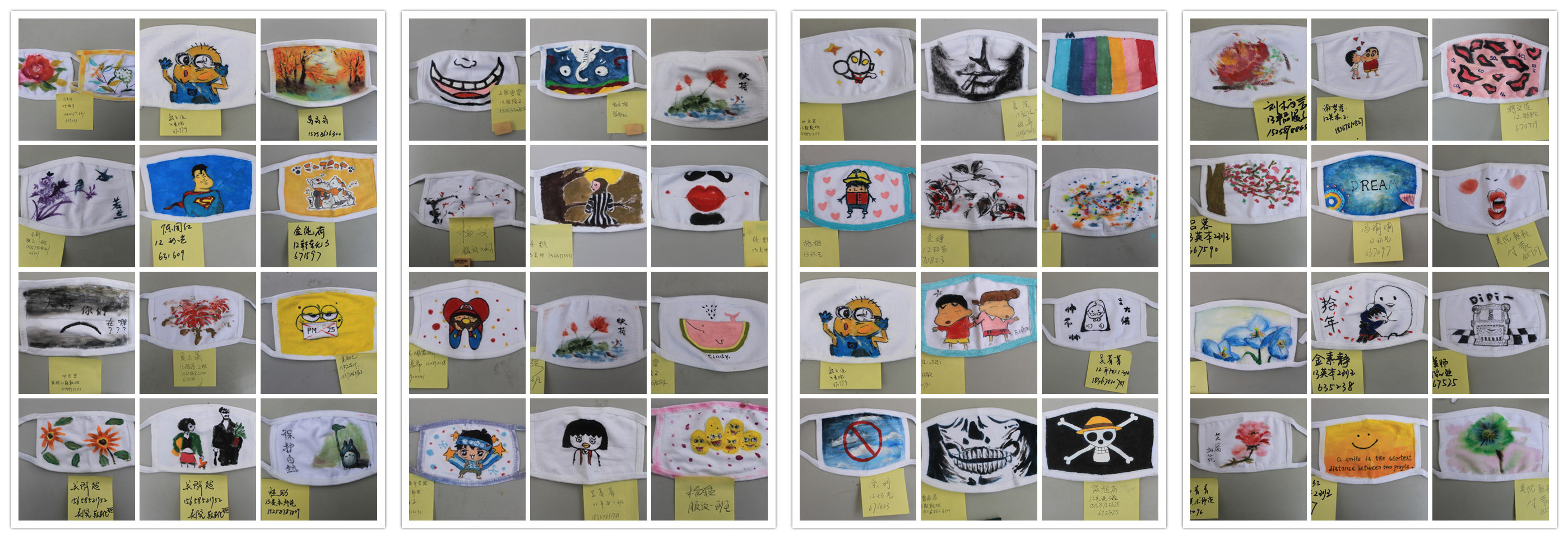 比赛现场,选手们发挥各自的奇思妙想,在口罩上绘制自己所喜爱的图画:有的是可爱的Q版卡通,有的是如诗般优美的画面,还有的是奇异诡怪的整蛊图画......选手们在绘画艺术的海洋中畅游,欣赏这如同烟雨朦朦般天气的美丽,现场气氛轻松欢愉,不时传来选手们的欢声笑语。在为时三个小时的比赛中,路过的同学们皆被这富有创意的比赛场景所吸引,愈来愈多的白色口罩“穿”上了专属定制的外衣。