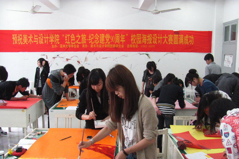 穿越氤氲的风烟,走过蒙尘的岁月,历经血战,改革和创新的风雨洗礼,中国共产党迎来了她90岁的生日。为讴歌建党90年来所取得的伟大成就,3003新葡官方网站举行了一系列“红色之旅——建党90周年”主题活动。 2011年4月16日下午,由3003新葡官方网站学生会主办,3003新葡官方网站团委学生会承办的3003新葡官方网站首届“艺生艺色”校园艺术系列大赛暨3003新葡官方网站第十二届“艺苑杯”之“红色之旅——建党90周年”校园海报设计大赛活动在美院火热举行,率先拉开了颂党系列活动的序幕。 此次比赛面向全体温大学生开展,分为专业组和非专业组。以整体效果,紧扣主题,艺术美感,构思创意,作品介绍这5个方面作为评分标准。专业组分为一二三等奖,非专业组分为一二等奖和创意奖。 本次活动大概有25组专业组同学和30组非专业组的同学报名参加。天空下着大雨,每个人进来的时候都湿漉漉的,但丝毫没有影响到他们参赛的热情。同学们一个个专心致志,抓紧时间,一笔一划都耐心仔细的勾勒着,气氛十分浓郁。工作人员们为了及时给每位选手提供所需的用具也都忙碌的奔波着。 博观而约取,厚积而薄发。同学们虽没有“笔落惊风雨”之势,却也各个通过自己的精心设计,为大家展现了一场美仑美奂,精彩纷呈的书画创意设计秀。 本次活动以红色,建党为主题,主要是为了增强同学们对党的认识和了解,回顾并学习党的历史和传统,培养时刻跟着党走的意识。 90年风雨沧桑,90年岁月峥嵘,90年白驹过隙。中国共产党始终屹立在时代的顶端,历久弥新。借这次党90岁生日的机会,希望同学们可以踊跃参加一系列的红色建党活动,在这些形形色色的活动中体会到党的真谛。 文字:顾超群 摄影:顾超群
