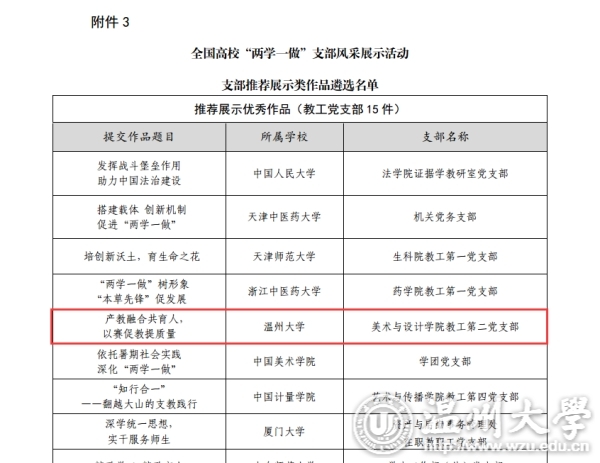 近日,新葡官网教工第二党支部的“产教融合共育人,以赛促教提质量”成果获全国高校“两学一做”支部风采推荐展示优秀作品,全国高校共有15个教工党支部获此荣誉。