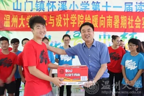 7月15日上午,校党委委员、副校长钱强在校团委副书记魏一、美院党总支副书记杨振海、校团委办公室成晓等陪同下,专程赴平阳县怀溪镇中心小学亲切慰问新葡官网“绘暖向南”暑期社会实践队,怀溪镇委书记金建辉陪同慰问。