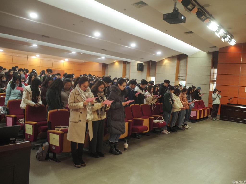 2018年1月10日下午,3003新葡官方网站在雁山厅召开2017-2018学年第一学期考风动员大会,3003新葡官方网站党总支书记张丽萍、副院长谢子静出席大会,17级全体同学参加会议,大会由学院党总支副书记杨振海主持。 张丽萍书记在动员讲话中重申了考风考纪的重要性和作弊的危害性,她强调学习在于平时的点滴积累,来不得弄虚作假,作弊不能弥补学习上的漏洞,而是一种自欺人人的行为。张丽萍书记还鼓励同学们认真备考,争取考出好成绩。她强调:“大学里的每一次考试都是接受考核认证自我的途径,加强考风建设营造公平的考试氛围,既是每个同学的愿望也是每个同学应该肩负的责任。所以希望同学们在这次考试中能诚信做人,亮出真实的成绩,展现真实的自己。”杨振海副书记根据学生手册相关条例告诫同学们一定不能碰这个底线,在考试过程中不仅仅要交出反映专业知识水平的考卷,更重要的是在考试中要交出诚信的品行之卷。 17级全体同学在学生代表的引领下宣誓,承诺端正考试态度认真复习积极备考。 学生处吕乐老师进行大学生文明修身考风考纪专题讲座。学生处吕乐老师通过精彩的演讲和亲切的互动,加深了同学们对考试作弊的危害的理解,相信同学们也一定会用真实的成绩证明自己的实力,成为一名诚实守信的大学生。 大会还总结了本学期学风考勤和晚自习考勤情况,与会领导对本学期优秀纪检委员进行了表彰。