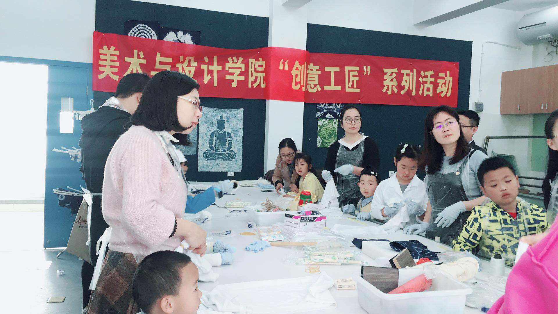 4月1日上午,3003新葡官方网站开展了“亲子扎染”活动,美院学生创业团队皓翔美术团队组织家长和孩子们参与制作扎染围巾,并参观了美院工业设计等艺术展览。