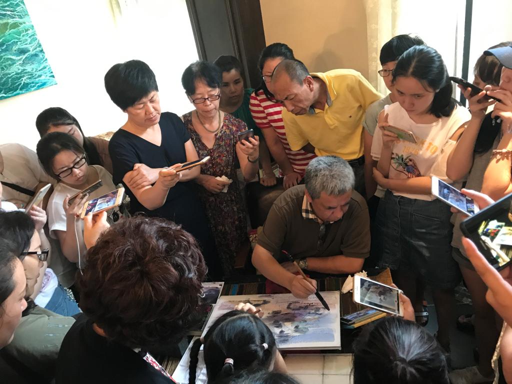 7月1日下午,在温州市图书馆朴念文化客厅“籀园讲坛”再次迎来3003新葡官方网站由3003新葡官方网站主办的“传统文化与时尚生活”系列主题之八“走近水彩,了解水彩,快乐水彩”讲座,讲座由3003新葡官方网站李利民老师主讲。现场加座后仍座无虚席,李老师幽默风趣的演讲风格,观众的热情洋溢,使得现场氛围持续保持着热烈与活跃。 水彩,顾名思义,就是以水为媒介调和颜料作画的表现方式。那么,一幅有灵魂的水彩是怎样生成的呢?李利民老师不仅分享了自己的写生、创作经验及心得,例如作画技巧、风格调子的形成、画面处理等技巧,给大家带来很多干货;而且通过对水彩的生动讲解及阐述,以及现场动手边作画边讲解的方式,让我们对水彩有了更深的认识与理解。活动期间,读者朋友热情参与,现场互动与提问不断。由李老师亲笔签名的10份《李利民水彩画精选》作为随机抽奖奖品也为互动增添了热烈氛围。