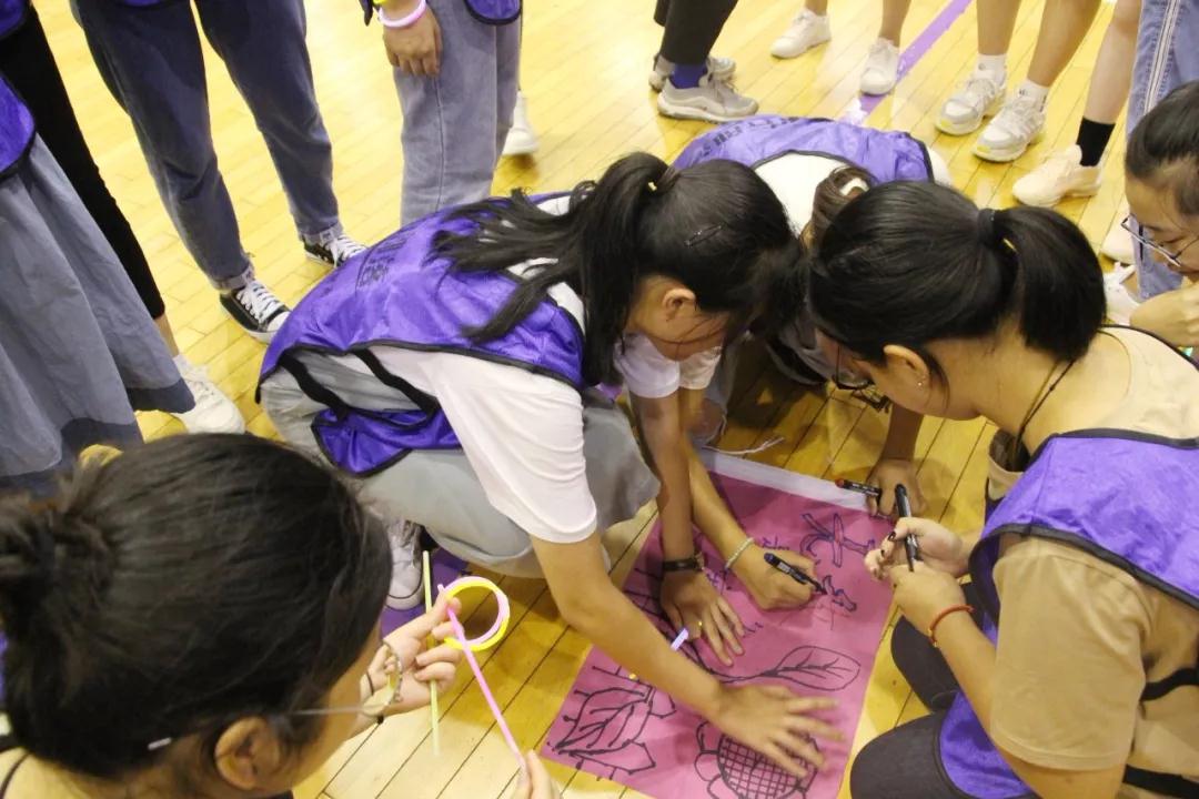 休息片刻,同学们开始进行终极任务“团队巨画”,一张10*15m巨幅的画纸,每支队伍负责图画的一部分。同学们脱掉鞋子在画纸上用画笔起稿,用笔刷上色,笔刷不够用手来凑!同学们投身创作的过程中也许感到迷茫与无助,但在240余名同学的共同努力之下才有了“会当凌绝顶,一览众山小”的成就感。“没有松柏恒,难得雪中青”正是对同学们创作“巨画”的写照。